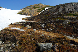 小雪渓の上部にやってくると山肌が黒い事に気付く。近づいて確認すると、枯れた高山植物が燃えていて山火事が発生したようだ。雪の上に散乱していた燃えたカスが雪の中には無かったので最近の出来事だと知るが、どこが発生源か分からない。