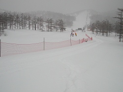 高峰温泉が運行する雪上車専用の道を歩いていると、雪上車が静かに追い越していった。室内が狭そうで雪上車に乗ってる人も窮屈そうに見える。一般の人は雪上車を利用しないと高峰温泉へたどり着けないかもしれない。
