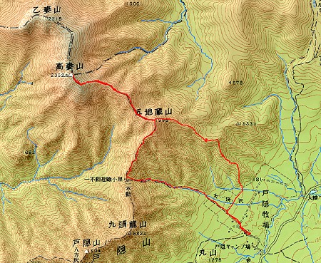駐車場(3:57)〜一不動避難小屋(5:10)〜五地蔵山(6:00)〜高妻山(7:39)〜分岐(9:00)〜牧場(10:00)〜駐車場(10:17)