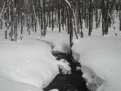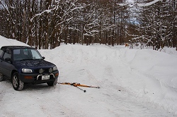 ここから大橋林道に方向を定めて、ちょっと混雑している森を通り抜ける。しばらくするとトレースが残る大橋林道に到着した。 シールを剥がし、楽して帰ろうかと思っていたが、傾斜が緩すぎて快適に滑れない。歩いたり、ストックで漕ぎながら、何とか車まで戻ってきた。