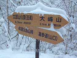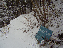 ストックだけ持って山頂を目指したが、ずーっとトラバースする登山道は、落ち葉と雪で非常に滑りやすく、軽アイゼンを持ってくれば良かったと後悔する。 ここの登山道は少々藪っぽいところもあるが、以前にも通ったことがあったので何とか迷わず大峰山の登山道に合流した。