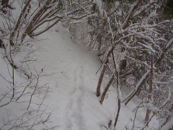 山頂までやってくると人間の足跡があった。 神社経由で来た道を戻ることにするが、表参道には大勢の人達が歩いたような跡があり、神社までは遊びに来るみたい。