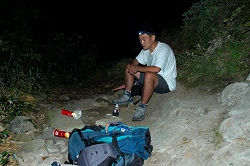 休憩に適した五十間長屋に到着した。ここから八方睨まで遠くないが、もしもマッケンが落ちたら助けにいけないので、すんなり頂上を諦め、もう1度よくよく確かめながら下山する。撮影時間に1時間ほど費やして、夜明けに台風一過の真っ赤なの空を見れば大満足だろうと目論んでみるが、キノコも真っ赤な夜明けも見ることができない1日だった。 |