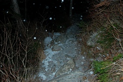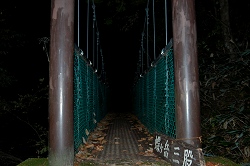 ゲートを越えて登山指導所に到着すると遭難者の張り紙があって、暗闇の恐怖と水の流れる音で余計に怖さを増す。吊橋を渡る時には、ビビリまくりだ。