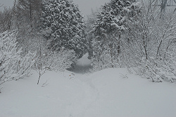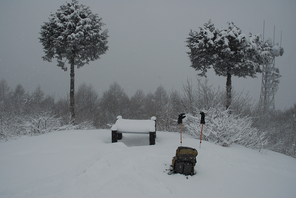 リフトトップから100mの距離だったけど、ツボ足では大変そうだったのでシールを装着して歩き出す。山頂は大雪の影響で展望なし。帰りは探索を兼ねて迂回コースから駐車場に戻る。