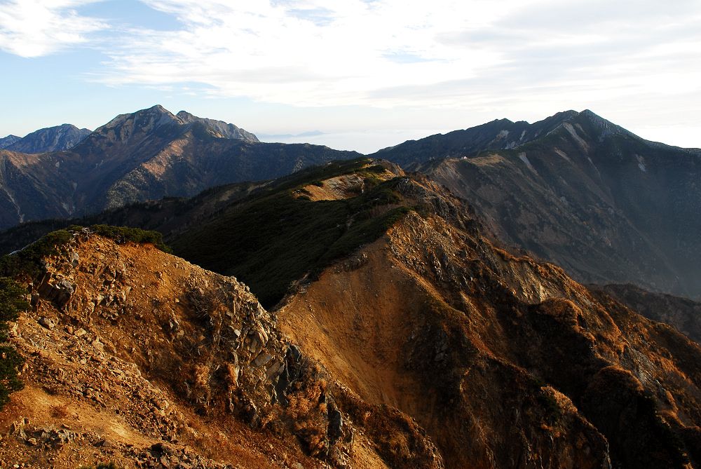 夜明けの時間を考えると、のんびり休憩しながら歩いてると山頂に到着する前に夜が明けてしまうので、行き先を変更して岩小屋沢岳から爺ヶ岳を眺めようと提案するが、本当の事を言うと、1ヶ月以上も運動をしなかったので、その時間までに到着出来ないんじゃないかといと心配になっていた。