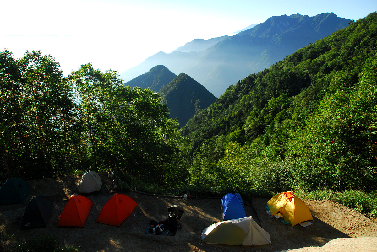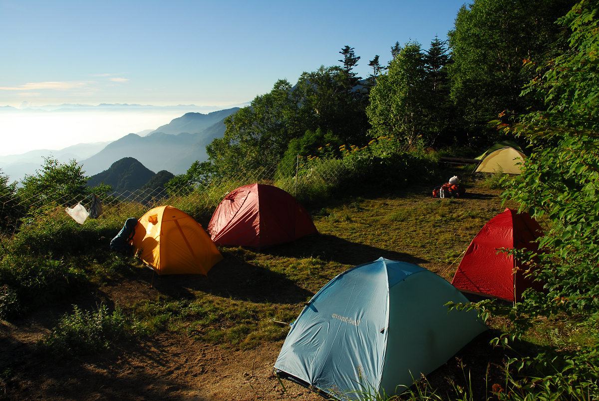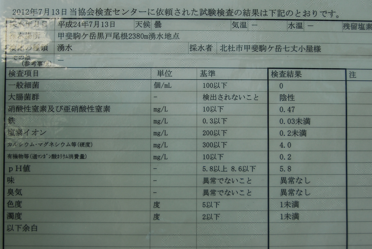七丈小屋にあった水質の検査表には驚いた。山で見たのは初めてだったけど、登山者の為に気を使っているようだ。 また、テント場にはトンボやペグが置いてあり、なかなかレベルの高いキャンプ場である。