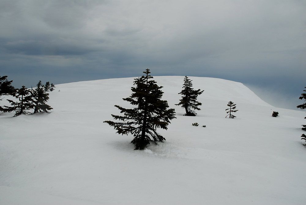 朝は晴れてたけど天気予報が外れて雨も降り出してきた。おまけに風も強い。山頂では隠れる場所が無いので、装備が飛ばされないよう注意しながら雨が止むのを待つ。