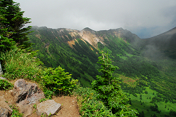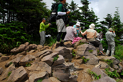 黒斑山周辺は学校登山とか団体さんが多く、夏山らしい雰囲気で賑わっている。山頂の標識は団体さんに占領されてしまい近づくことは出来なかったけど、湧き上がる雲の隙間から浅間山とか外輪山が見えるたび歓声が聞こえてきた。