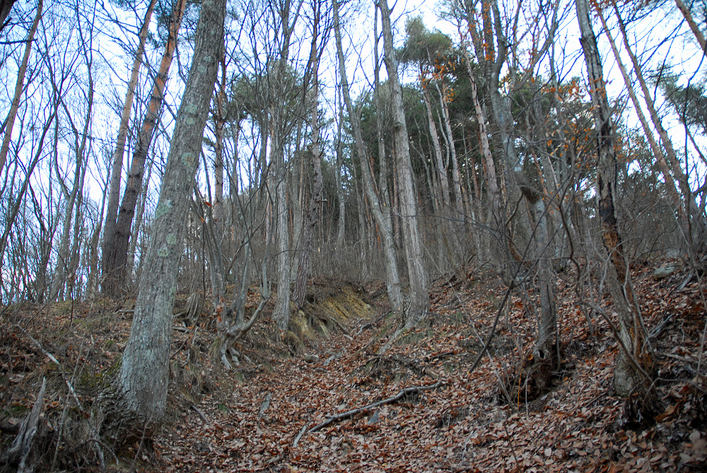 あんずの里から林道に入り、踏み跡がある尾根から鉄塔を経由して大峰山の山頂へ。パッとしない山頂だったので、もう少し先へ行ってみると林道があった。そこには鏡台山の標識もある。
