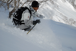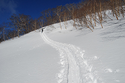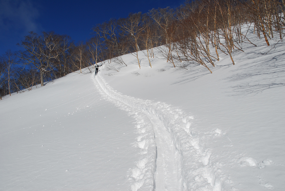 先頭でラッセルしてくれた人に御挨拶をしてからいつもの場所へ飛び込む。しかし、雪が深くてスピードに乗れず 、ヨタヨタしながら平坦な場所へ到着。