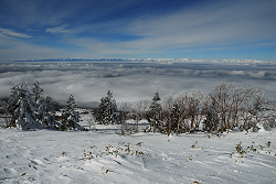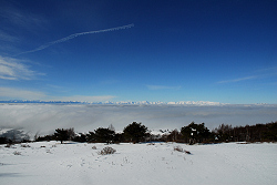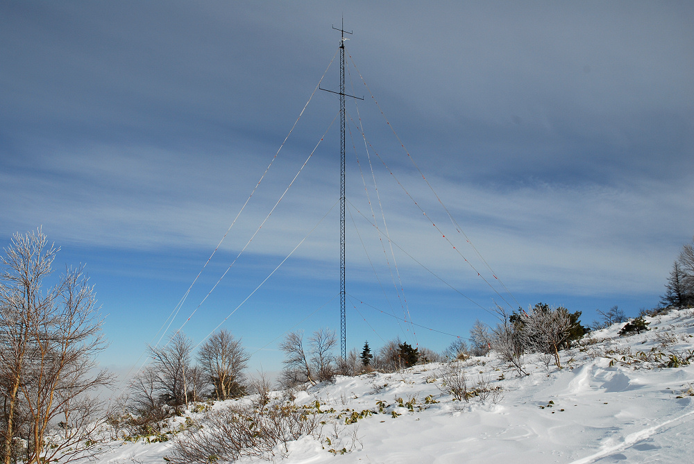 風力発電建設の為に作られた鉄塔の辺りから青空が見え始め、どこまでも良く見える。気温も駐車場に比べたらだいぶ高いようだ。