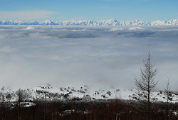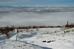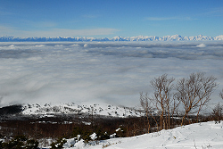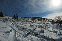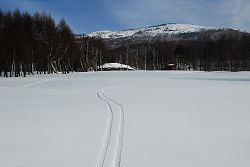 のんびり写真を撮りながら根子岳の山頂に到着。今日はどこへ行っても辛いスキーになりそうなので、コースを外れて牧場経由で駐車場に戻る事にした。