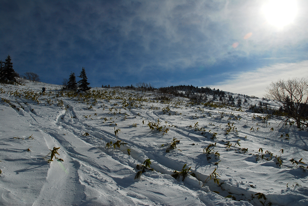 ツアーコースの入口までやってくると、そこそこ雪が増える。しかし、あんまり良い雪ではない。予想はしてたけど、センター幅の広い板を履いてきて正解だった。完全なベースが出来上がっていないので笹の上を滑るようになるけど、簡単に曲がれるか心配になってきた。