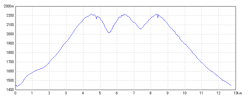 鞍部に広がる斜面は、雪が良ければ最高に面白そうな場所である。しかし、南斜面と風の影響で滑る前から難しそうに見える。こんな時は思いっきり滑るに限るけど、超モナカ雪だったのでターンのたびに転びそうになって撃沈する。