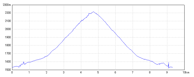 上部ではトレースを外すことができず直滑降。避難小屋を過ぎた辺りから沈まなくなってゴルフ場を抜ける。途中で雪不足によりショートカットに失敗して、大回りをする羽目になった。