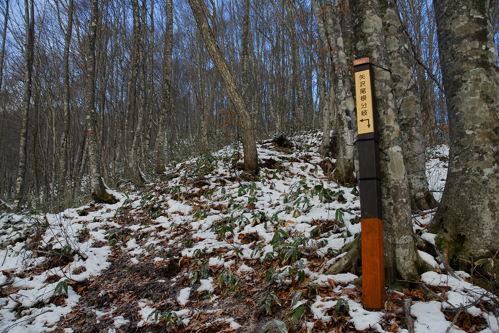 ブナコブ平を過ぎると傾斜も落ち着いてきて積雪量が増える。落ち葉の上に雪が乗っているので気を抜くと転びそうだ。