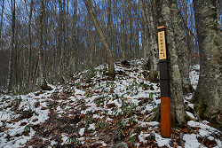 ゲレンデの中間地点までやってくると登山道の標識があり、ゲレンデからか離れるように尾根に取り付く。里山と行った感じで道もハッキリしている。