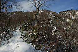しばらくすると急登が始まり、雪で踏み跡も怪しくなってきた。