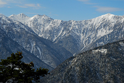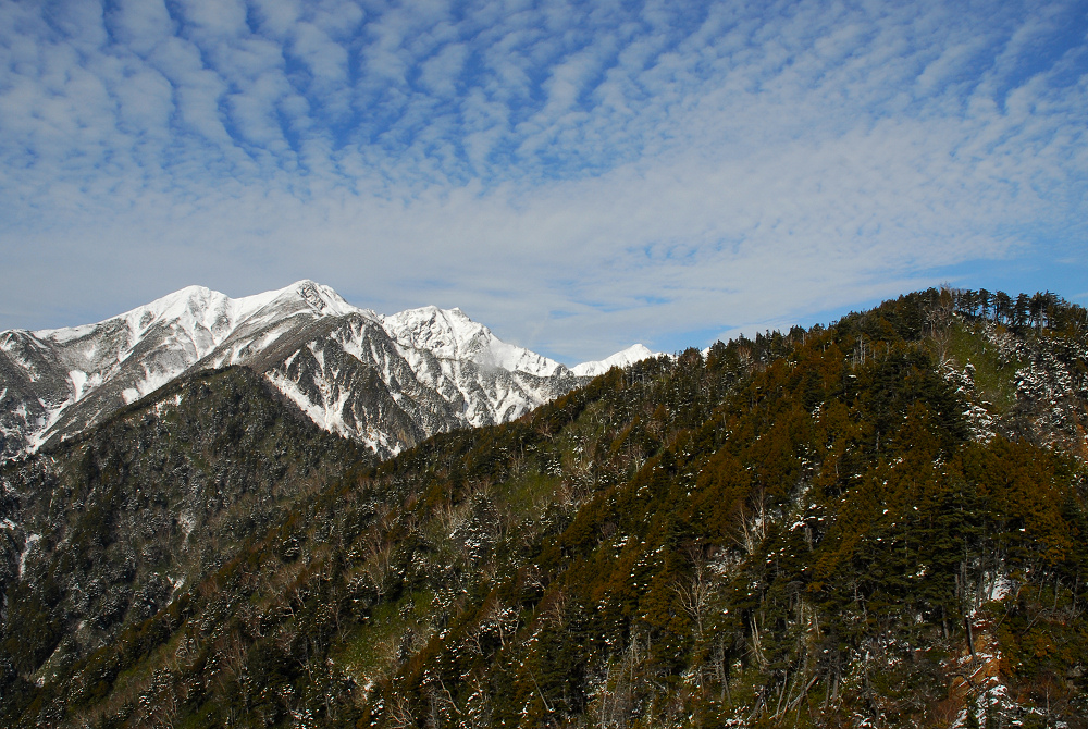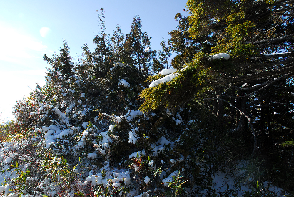 ドキドキしながら何とか稜線に這い上がったけど、帰りはアイゼンが無いと下れそうにない。道もハッキリしなくなってきたので歩きやすそうな場所を選びながら慎重に進むが、岩と笹に阻まれて三角点まで行くのを諦めた。仕方が無いので見晴らしの良い場所を探すも、見たかったか爺ヶ岳や針ノ木岳は木の隙間から僅かしか見えない。