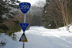 八千穂側のゲート前に車を停めてテレマークスキーで歩きだす。道路にはスノーモービルが通った跡があり、ツボ足でも十分なぐらいの積雪しかない。鱗の板でも登っていけそうな緩やかな道だけど、道なりに歩いてると遠回りになるので、地図を読んでショートカット出来る所はラッセルして進む。