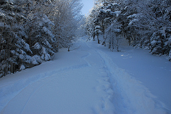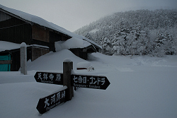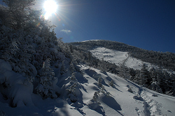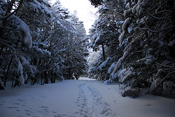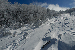 7合目登山口から日差しが届かない森の中へ突入すると、指先がジンジンするほど寒くなる。風は無いけど100円の手袋では限界のようだ。天狗の路地で滑る予定の斜面を偵察して再び登山道を登り始める。