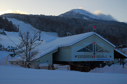 登山道に戻ってからはトレースに乗っかってゲレンデまで快適に移動する。ゲレンデも適当に滑って駐車場に戻ったけど、午後から天気が良くなったようで蓼科山に雲は見当たらなった。