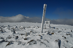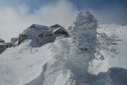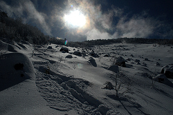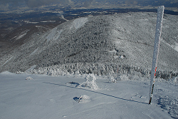 山頂付近は風が強かったので三角点のある場所まで行き退却する。風の弱い場所を探してシールを剥がし登山道をめがけて滑りだすが予想以上に硬くて楽しくない。樹林帯の中に滑れるそうな場所は無いので、先ほど登ってきたトレースの脇をクネクネと滑り降りる。