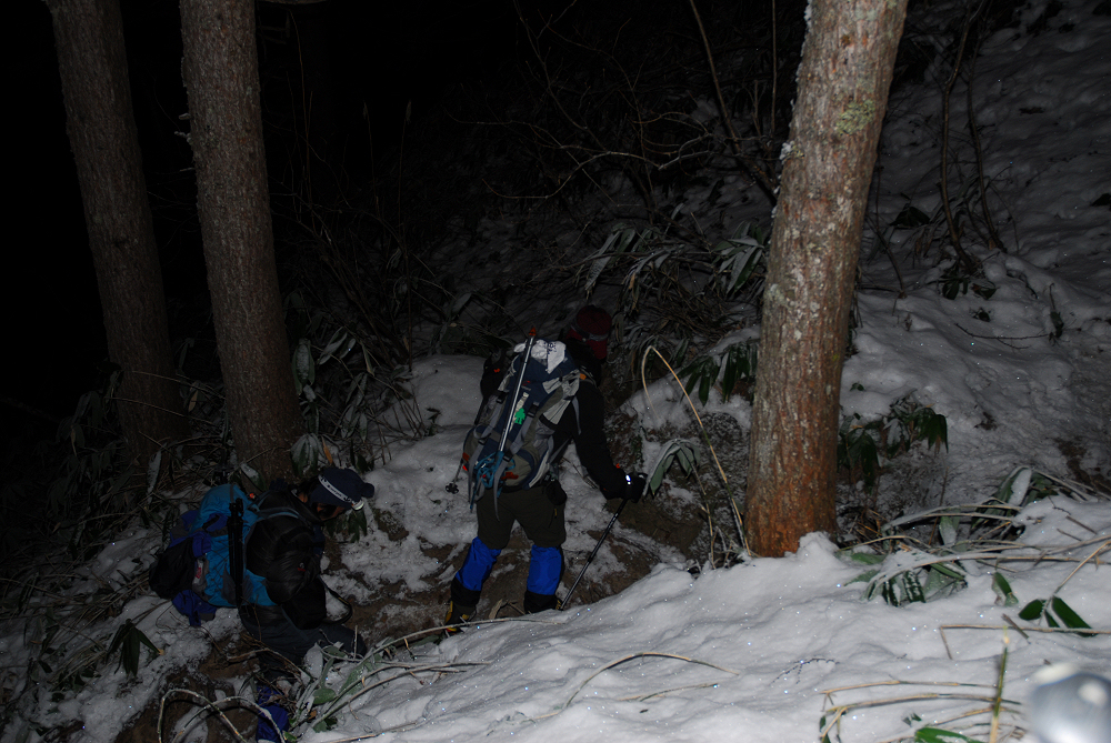 登山口から雪が現れ、踏み跡がガチガチなので転ばないように慎重に登っていく。