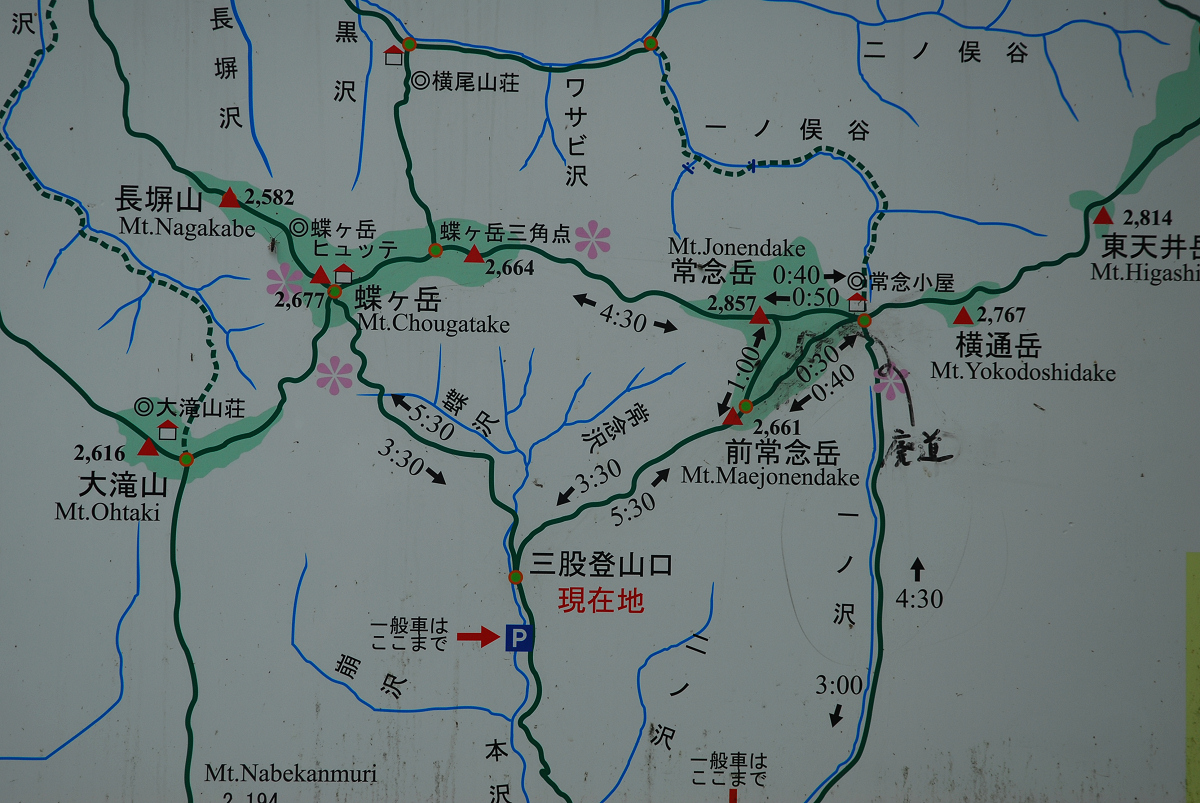 4:47)-(前常念岳 7:24)-(常念岳 8:11)-(蝶槍 10:18)-(蝶ヶ岳ヒュッテ 11:02)-(蝶沢 12:19)-(三股駐車場 13:43)
