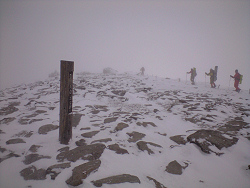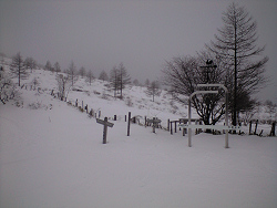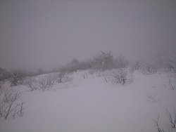 10人ほど追い抜いて湯の丸山の南峰に到着する。当然の事ながら視界不良。それでも北峰へ行く人達やコルから滑り降りる人達が大勢おり、立ち止まること無く南峰を通過していく。