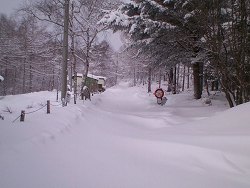 前日から降り続いた雪は30~50cmほど。まだ誰も歩いていないので林道にトレースは無い。