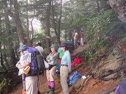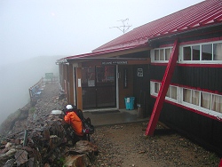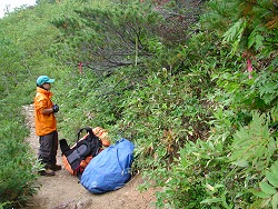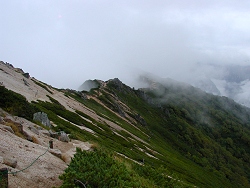 中房温泉(5:32)〜第一ベンチ(6:12)〜第二ベンチ(6:45)〜第三ベンチ(7:24)〜合戦小屋(8:39)〜燕山荘(9:48)〜貧乏沢入口(13:34)〜ヒュッテ西岳(15:40)