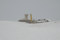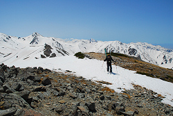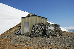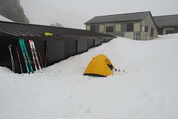 なるべく雪が硬いうちに蓮華温泉を出発して、楽に天狗原へ到着できるかと思っていたら、向い風が強くて進むのが嫌になる。我慢しながら天狗原が見える尾根に上がると目の前にヘリポートがあった。新聞でヘリポートの位置が変更になったのは知っていたけど、祠の前まで移動するには大変そうである。