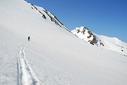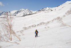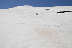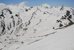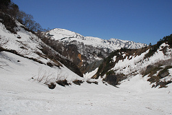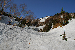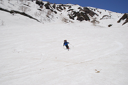陽が上がり、気温もグングンと上昇してきたらしく、斜面が崩壊する音がたびたび聞こえてきたので、あまり遅くならないうちに金山沢を滑り始めるが、なかなかデンジャラスなコースで急いで通過する。