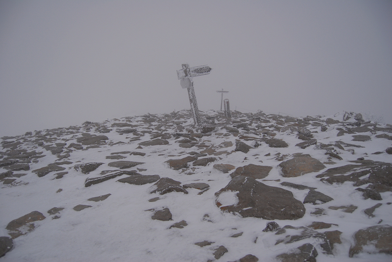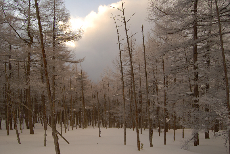 モルゲンロートを狙って湯の丸スキー場にやってきたが、天気の回復が遅いようで雪が舞っている。