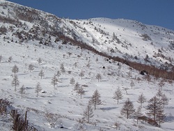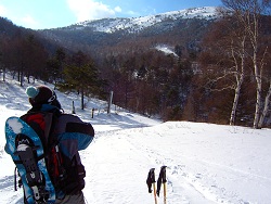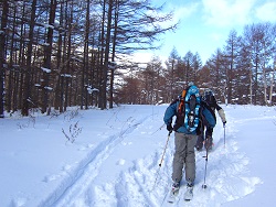 バックカントリー初心者は、経験豊富な山岳会のお姉さんに任せて、自分はボリさんとノロノロ歩く。僕は膝で、ボリさんは心臓。どっちも無理できないので、滑る場所を説明しながらスノーシュー組を追いかける。