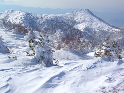 今日に限って細板のシールを持ってきてしまった。ちょっとでも傾けるとズルズル滑って後退してしまい、さらにスノーシューの跡が登りにくさを増す。何とか途中まで頑張ったが、ツボ足のほうが速そうだったので、板を背負って南峰にやってきた。 |