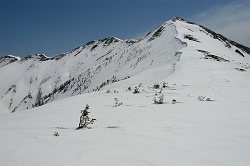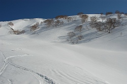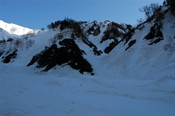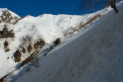 しばらくすると南峰の斜面が見えてきた。どこでも滑れそうな感じだが、アンカーとなる木が少なくて、雪崩が発生しそうで怖い。木曜日に降った雪が、どれだけ結合してるか分からないけど、巨大な雪屁が落ちていないので、危険な場所は、さっさと通過することにした。
