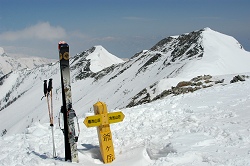 誰もいない山頂で、のんびり景色を楽しんでから下山の準備に取り掛かるが、今日の陽気だと、あまりのんびりしてられない。さっさとシールを剥がして、ちょっと下った場所から滑走を開始する。しかし、いきなり大斜面に飛び込む勇気は無いので、スキーカットしたり衝撃を与えながら、落ちていった雪の様子を見て、滑走ルートを考えることにした。