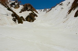 先週降った雪も無くなり、やっと春山らしくなってきた。まだ道路脇には雪の壁があるけど、カチカチに凍っているので雪崩の心配も少なそう。堰堤の通過も問題なさそうだし、南尾根から登るよりも、滑走コースの下見を兼ねながら雪渓を登ったほうが効率が良さそうである。