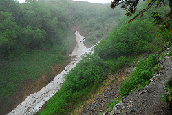 ダラダラと下を向きながら歩いていたが、柏原新道の危険地帯に到着する頃には本降りとなってしまい、休憩を兼ねて雪渓の脇を流れる川で水筒を満タンにする。雨が降った時しか流れないようだが、今日は山荘で水を購入する予定だったので、ちょっとザックが重くなってしう。