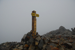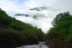 しばらくしてから登山道を下り始めたら、だんだんとガスが消えて蓮華岳が見えてきた。30分ほど様子を見えていたが、次第にガスが湧き上がってきて、再び上り返しても好天になりそうな予感がしなかったので、さっさと下って西条温泉に移動した。