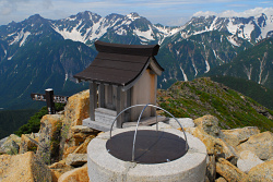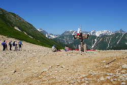 ちょっと飛ばしすぎたか、常念乗越で大休止する。 乗越からは槍や穂高がバッチリ見えてて、真っ青な空が夏山らしさを引き立てている。
